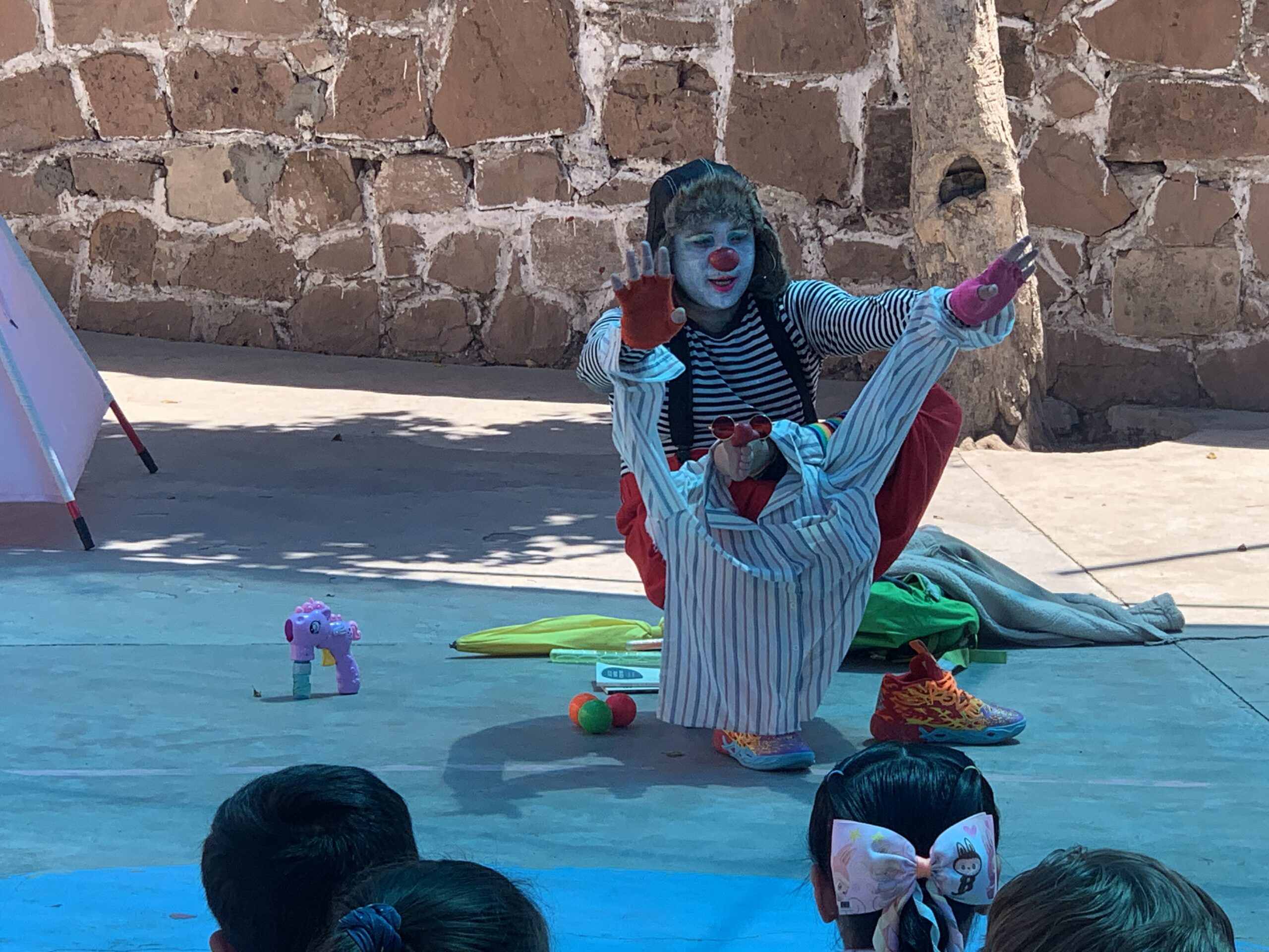 Ante decenas de pequeños sentados en el patio de la escuela, el también actor presentó el espectáculo interactivo que combina danza, música y teatro. basado en