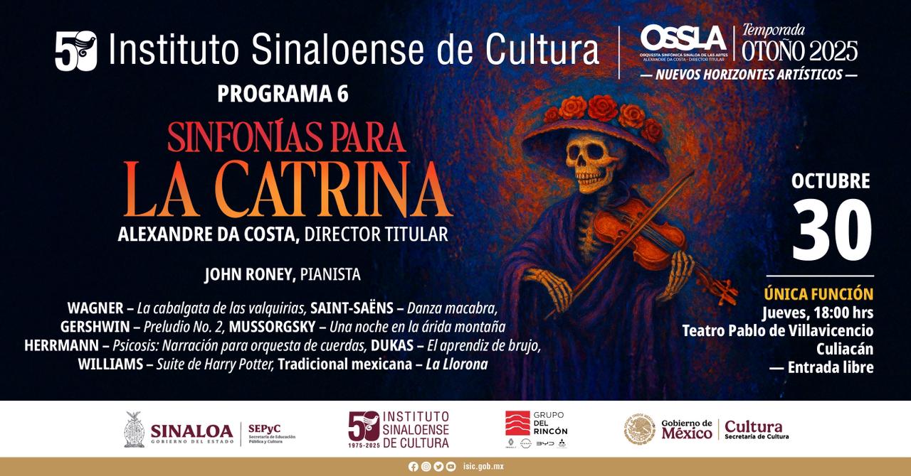 Culiacán, Sin.- Con temas alusivos a estas fechas en que, según diferentes tradiciones, las almas de los muertos tienen permiso de volver a la tierra, la Orquesta Sinfónica Sinaloa de las Artes presenta este jueves 30 su programa No. 9 de la Temporada de Otoño 2029, Sinfonías para la Catrina, bajo la conducción del Mtro. Alexandre Da Costa, director titular, y como solista, el maestro John Roney al piano.