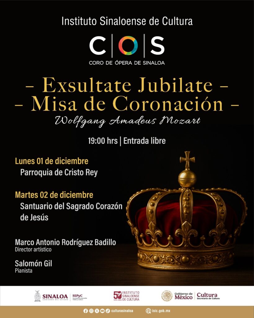 Culiacán, Sin.– El Coro de la Ópera de Sinaloa del Instituto Sinaloense de Cultura (ISIC) ofrecerá dos conciertos este lunes 1 y martes 2 de diciembre a las 19:00 horas, en la parroquia de Cristo Rey y en el Santuario del Sagrado Corazón de Jesús, respectivamente, donde interpretará las piezas corales “Exultatejubilate” y “Misa de coronación”, de Wolfgang Amadeus Mozart.