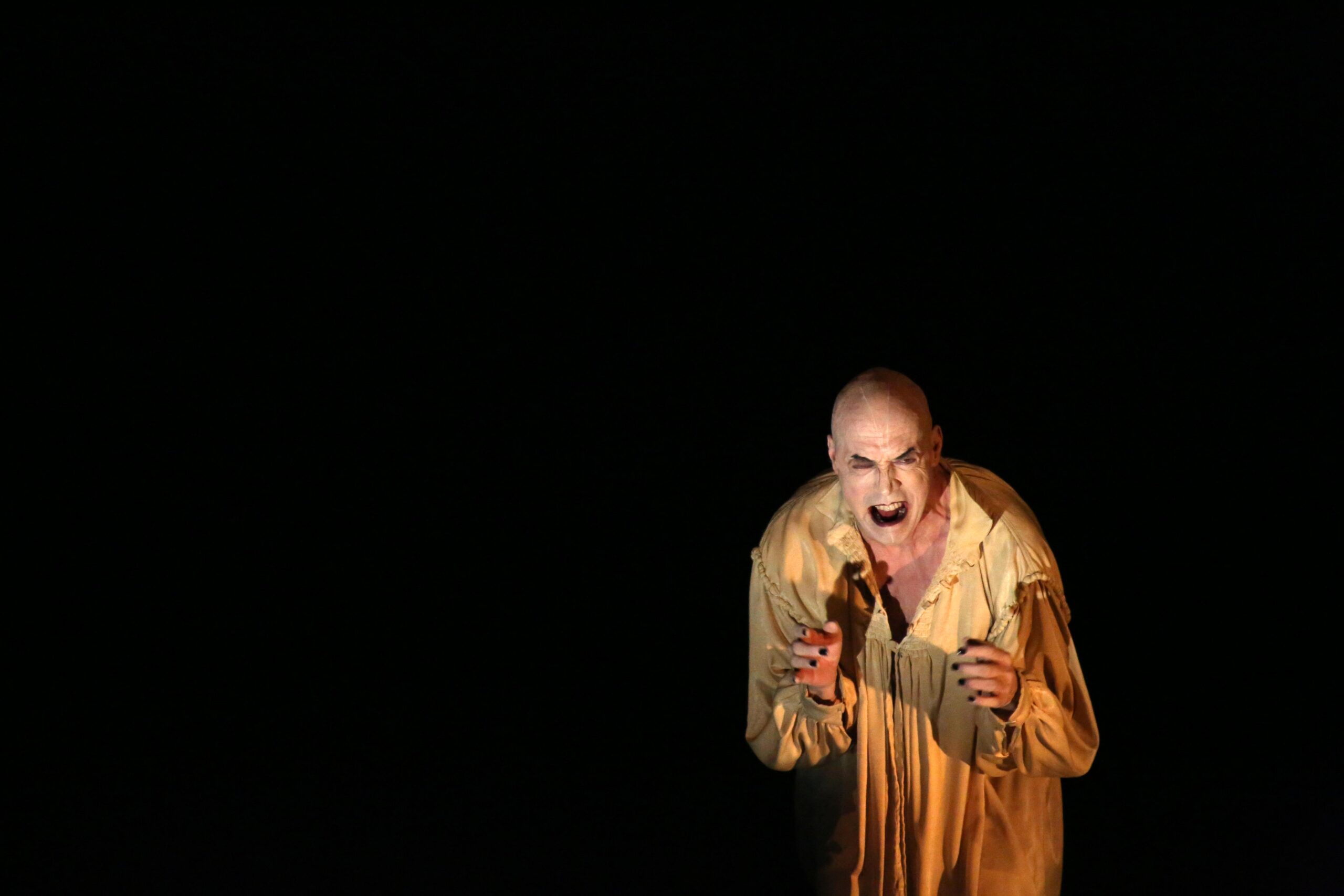 Y eso es exactamente lo que hace el actor, ataviado con un camisón que lo mismo ha de ser un sudario, pálido el rostro, y poseído por una voluntad supra normal, durante dos horas sin pausa, encarna literalmente a un grupo de fantasmas, con el sonido del violonchelo de Claudio Peña acentuando las atmósferas y haciendo de un actor más de vez en cuando.