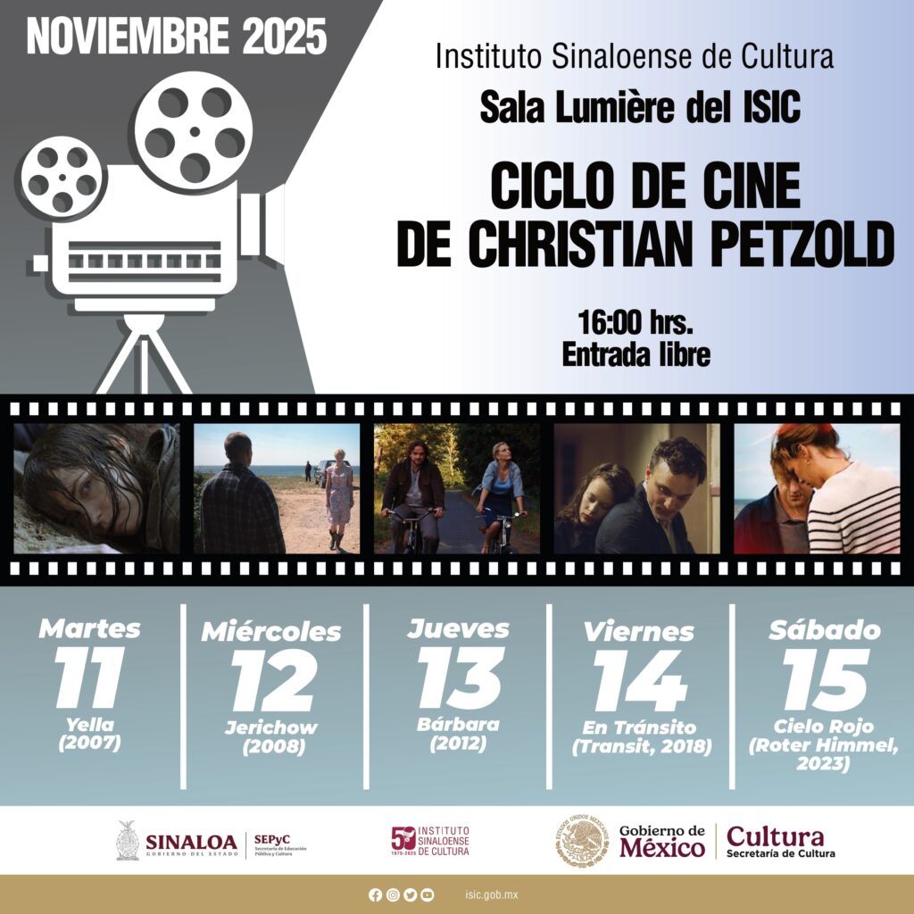 El ciclo inicia este martes 11 con el filme “Yella” (2007); continúa el miércoles 12 con “Jerichow” (2008); el jueves 13 con “Bárbara” (2012); el viernes 14 con “En Tránsito” (Transit, 2018), y cierra el sábado 15 con el filme “Cielo Rojo” (Roter Himmel, 2023).