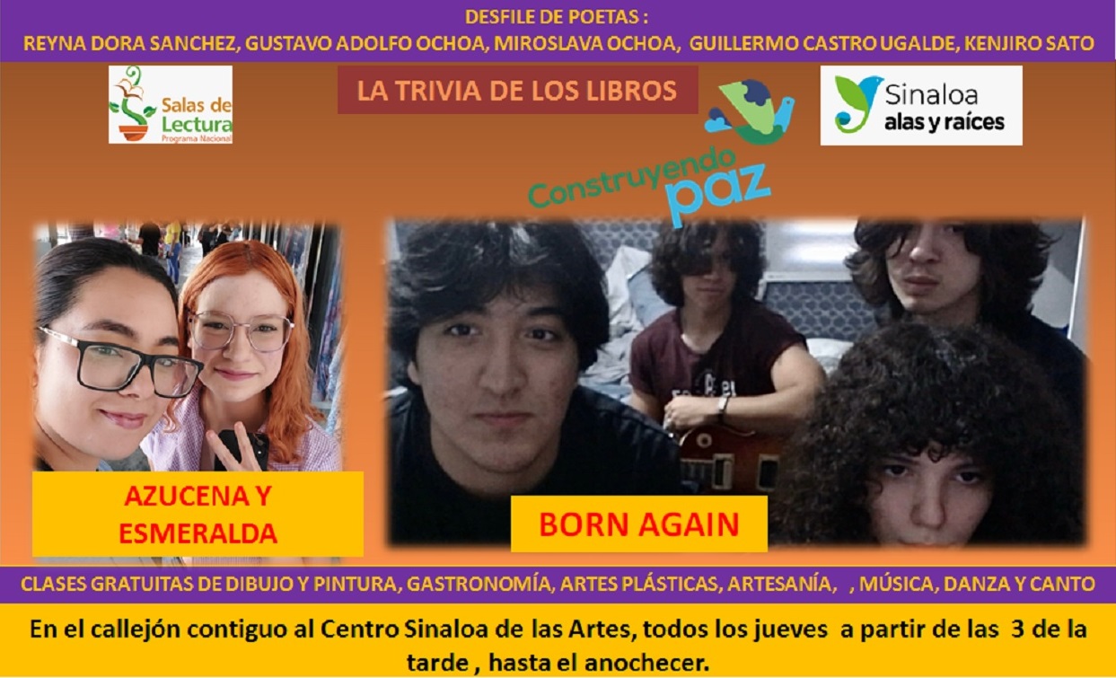 Y entre actos, la infaltable Trivia de los Libros, con el regalo de libros a quienes contesten sencillas preguntas de cultura universal, con volúmenes proporcionados por los programas Salas de Lectura Sinaloa y Alas y Raíces Sinaloa.