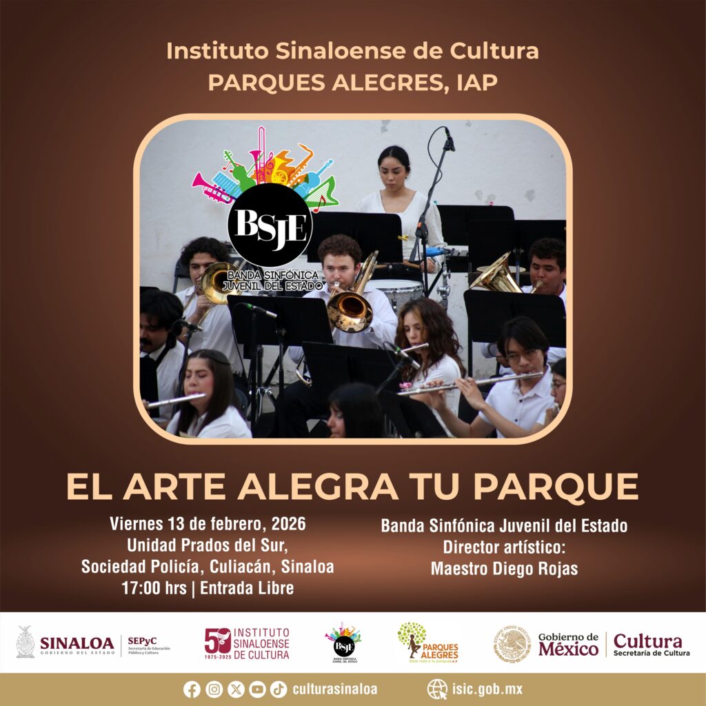 Culiacán, Sin.- El Instituto Sinaloense de Cultura, en coordinación con la asociación Parques Alegres, IAP, pondrán en marcha a partir de este viernes 13 de febrero a las 17:00 horas, con la presencia de la Banda Sinfónica Juvenil del estado en la Unidad Deportiva Prados del Sur, una nueva temporada del programa El Arte Alegra Tu Parque, para llevar los servicios del arte y la cultura de calidad a parques de nuestra ciudad.