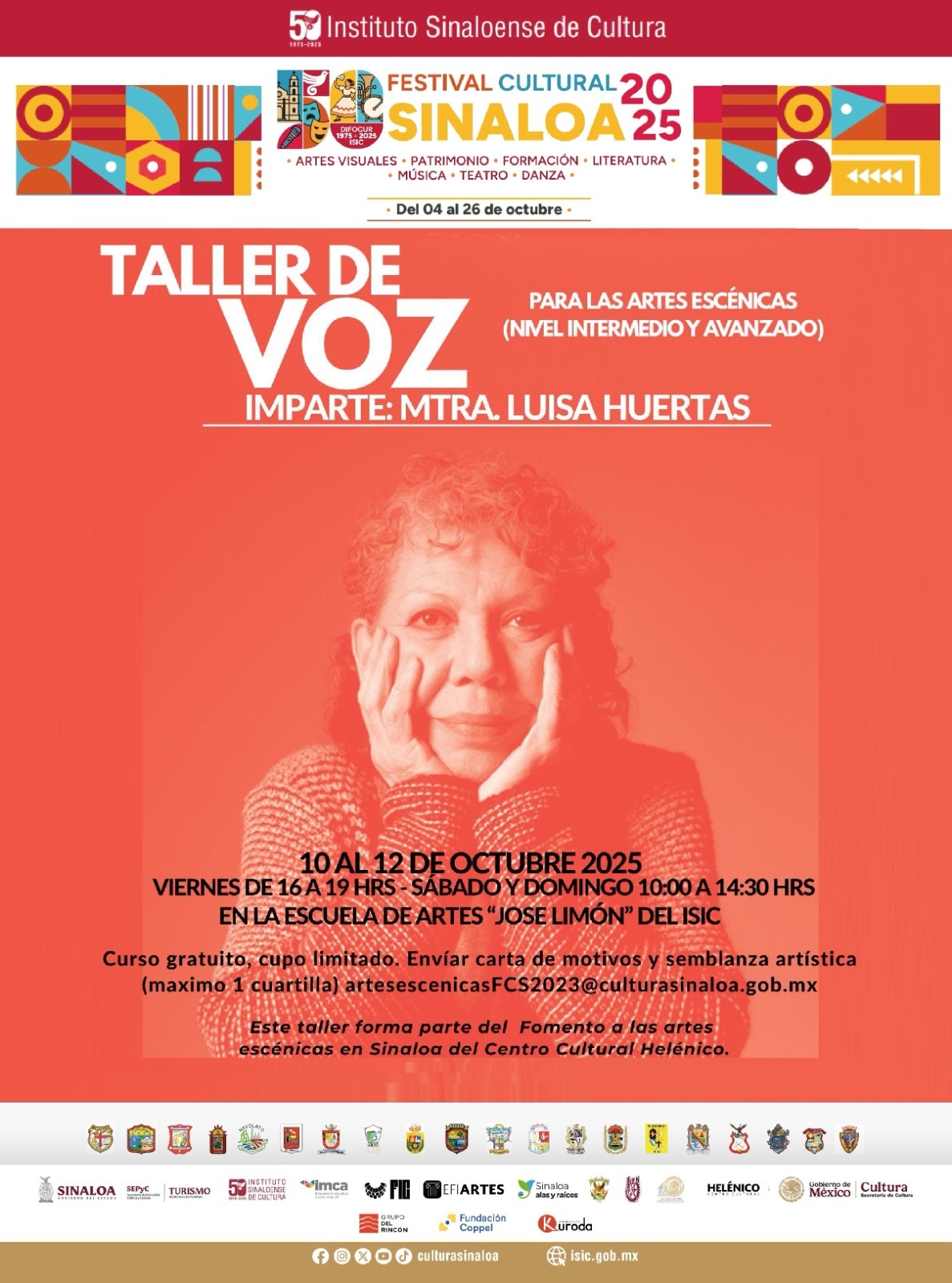 Culiacán, Sin.- El Centro Cultural Helénico, en coordinación con el Instituto Sinaloense de Cultura invita a los creadores interesados en participar en el Taller de voz para las Artes Escénicas, que impartirá la Mtra. Luisa Huertas, del viernes 10 al domingo 12 de octubre, el cual está dirigido solo a nivel intermedio y avanzado.