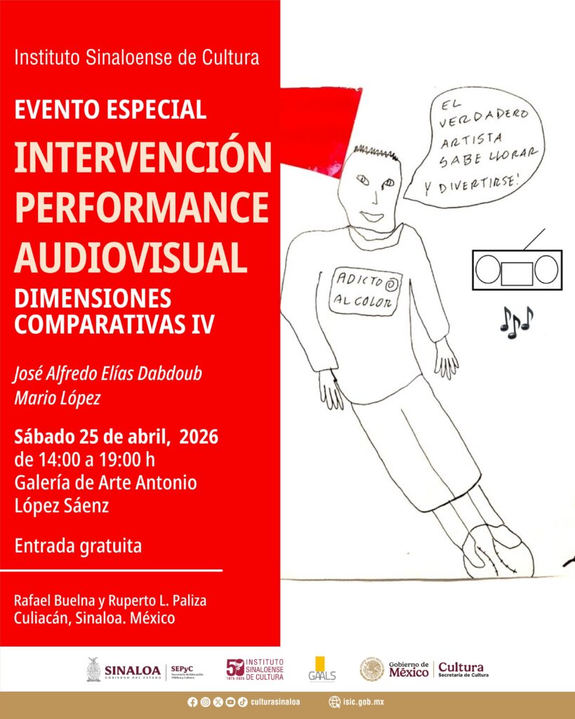 Culiacán, Sin.- El Instituto Sinaloense de Cultura a través de la Galería de Arte Antonio López Sáenz (GAALS) invita al público a vivir una experiencia artística fuera de lo convencional con la Intervención Performance Audiovisual: Dimensiones comparativas IV, que se llevará a cabo este sábado 25 de abril, en un horario de 14:00 a 19:00 horas, con entrada totalmente gratuita.