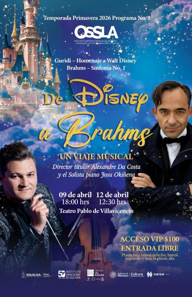 Culiacán, Sin.- La Orquesta Sinfónica Sinaloa de las Artes (OSSLA) invita a disfrutar del concierto “De Disney a Brahms”, una experiencia musical que combina fantasía, emoción y virtuosismo, a realizarse este jueves a las 18:00 horas en el Teatro Pablo de Villavicencio, con repetición el domingo a las 12:30 horas, como parte de la Temporada de Primavera 2026.