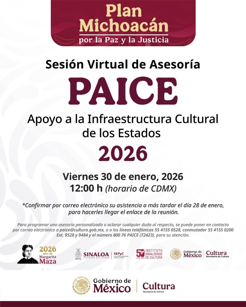 Culiacán, Sin.- Este viernes 30 de enero, a las 12:00 horas, (horario de la CDMX) se llevará a cabo una sesión virtual de asesoría para los interesados en participar en la convocatoria del Programa de Apoyo a la Infraestructura Cultural de los Estados (PAICE 2026), lanzada por la Secretaría de Cultura del Gobierno Federal, a través de la Dirección General de Vinculación Cultural.
