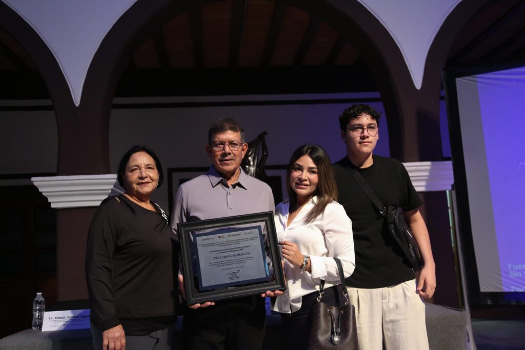 A nombre del gobernador, Dr. Rubén Rocha Moya, el Reconocimiento fue entregado por la Lic. Gloria Imelda Félix Niebla, secretaria de Educación Pública y Cultura, conla presencia del Lic. Héctor Jiménez López, coordinador nacional del Programa de Estímulos a la Creación y Desarrollo Artístico -PECDA- y del Sistema de Apoyos a la Creación y Proyectos Culturales de la Secretaría de Cultura; la Dip. Érika Rubí Martínez Rodríguez, por parte del Congreso del Estado, y como anfitrión, el Dr. Juan Salvador Avilés Ochoa, director general del Instituto Sinaloense de Cultura.