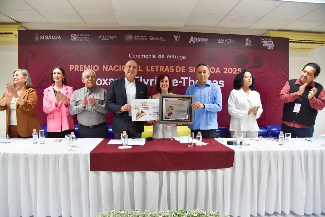 Los Mochis, Sin.- En una noche dedicada al poder de la palabra, la poeta, directora teatral, escritora y académica Roxana Elvridge-Thomas fue condecorada con el Premio Nacional Letras de Sinaloa 2025, reconocimiento otorgado por el Gobierno del Estado a través del Instituto Sinaloense de Cultura, en el marco de la Feria del Libro Los Mochis 2025.