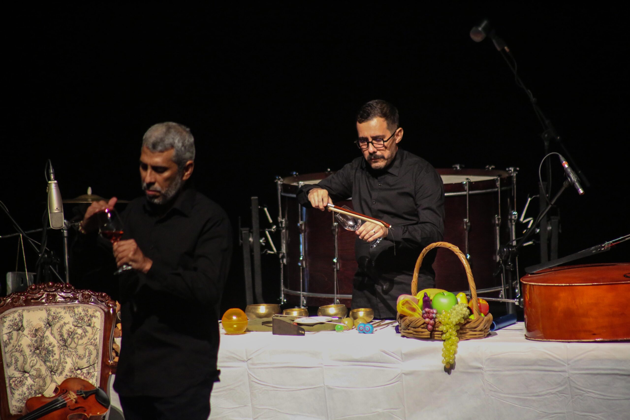 Le suman los sonidos rechinantes del contrabajo acostado en medio de la mesa, le agregan algunas otras percusiones, el desconcierto de un violonchelo que chilla y hace sonidos declinantes, lo mismo que el violín
